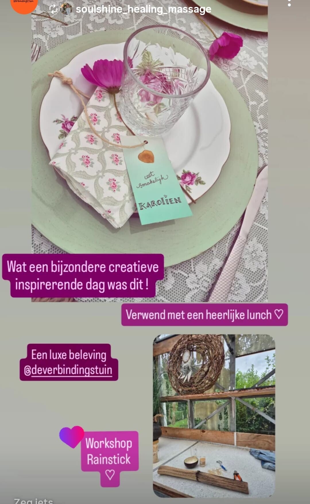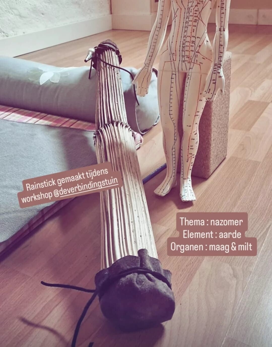 De natuurlijke materialen die je gebruikt, zoals de takken van berenklauw, zaden, edelstenen en andere natuurproducten, dragen niet alleen een eigen symboliek maar versterken je verbinding met de aarde. Terwijl je werkt aan je rainstick, wordt je gevraagd om stil te staan bij wat je hart je wil vertellen en hoe deze creatieve uiting je helpt om dichter bij je ware zelf te komen.